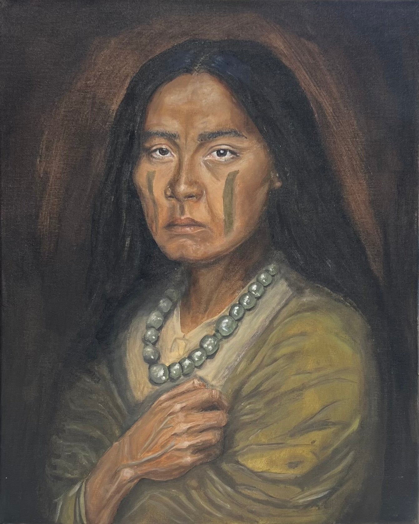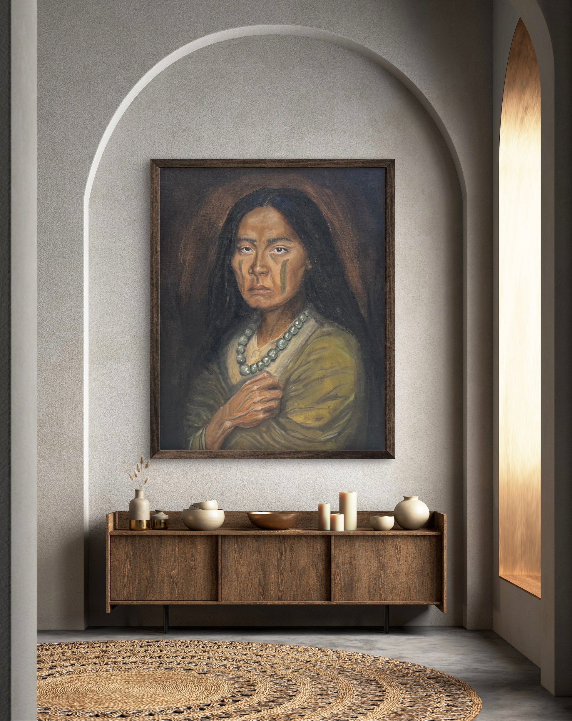 This portrait depicts a Nahua woman holding her clothing close, her gaze steady and unflinching. Painted in earthy tones, she carries the weight of hardship and survival. Her expression, both guarded and powerful, speaks of resilience, silence, and untold stories