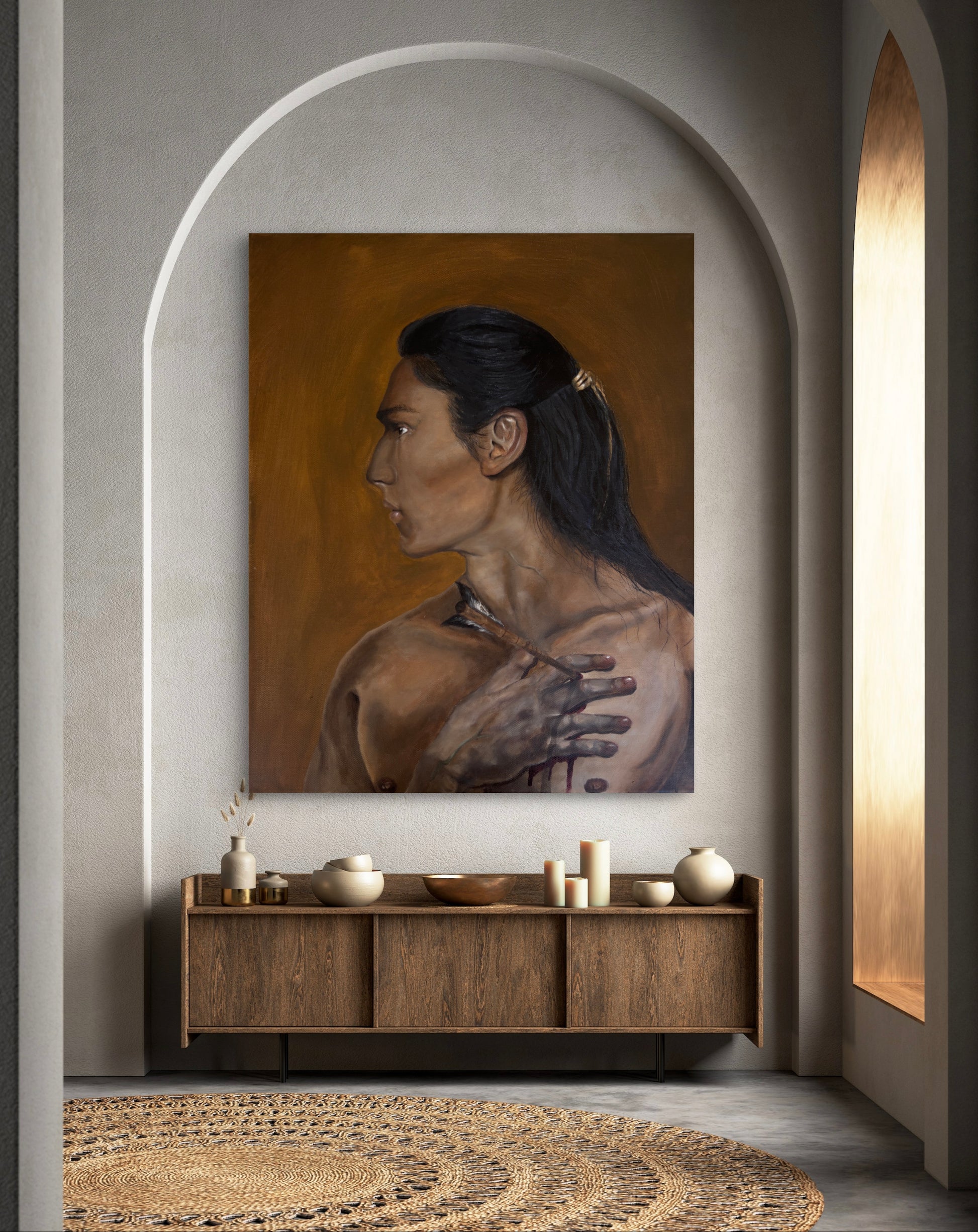 An indigenous man stands with an arrow lodged deep in his chest, yet his gaze is not broken. His body carries the mark of violence, but his spirit has long surpassed the weight of wounds. The arrow is silent against him, like a whisper against stone, for he has borne storms fiercer than steel and sorrows older than blood. His eyes do not bend to pain